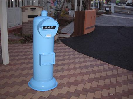写真左の真っ赤のポストを、目にも鮮やかな水色に塗り替えました。