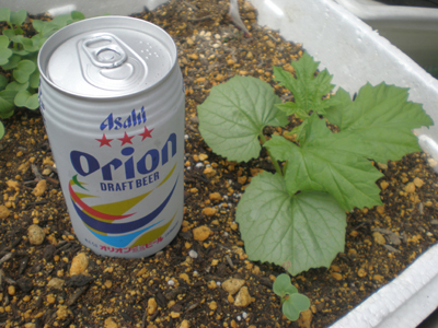 ゴーヤの苗を見ながら、収穫を思い浮かべて飲むのは、やっぱり沖縄のオリオンビールでしょ。