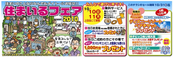 10月10日(日)~11日(月)の2日間 上田店に於きまして 毎年恒例 秋のイベント 【住まいるフェア2010】 を今年も開催いたします。 お買得品満載、お得な情報、催しものなどご用意しております。 是非、ご家族お揃いでお出掛け下さい! PR |