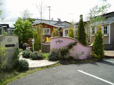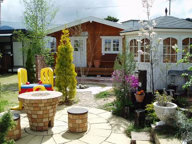 新緑の時期を迎え花や緑で囲まれてログハウスがいい雰囲気