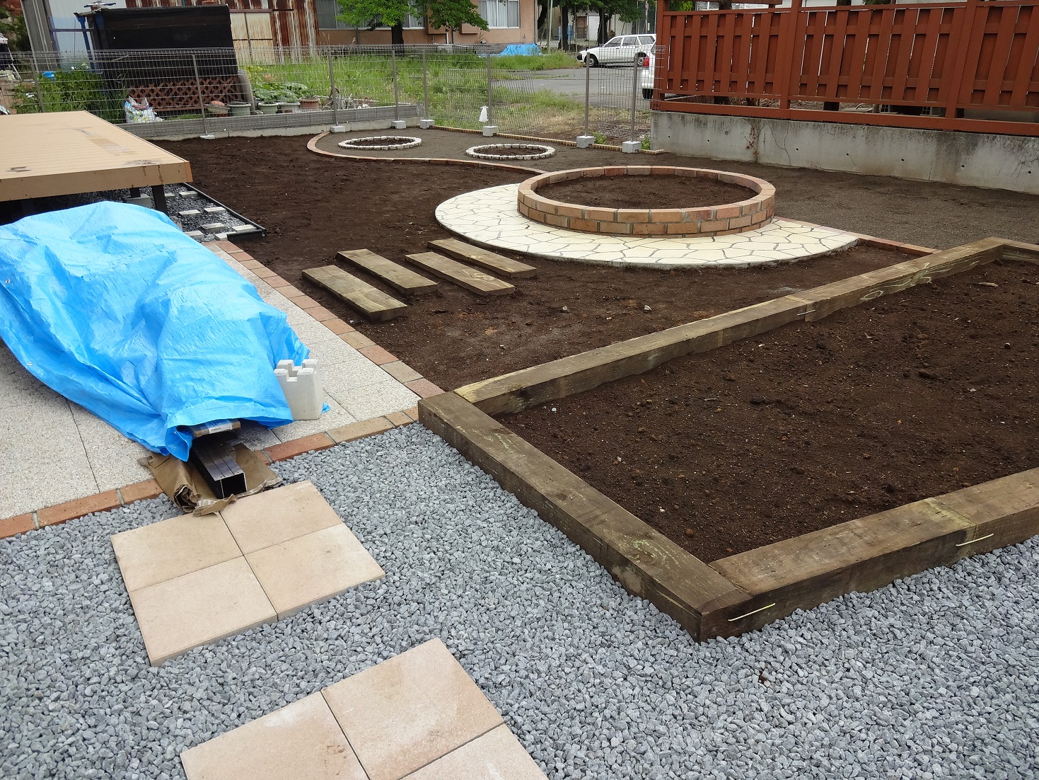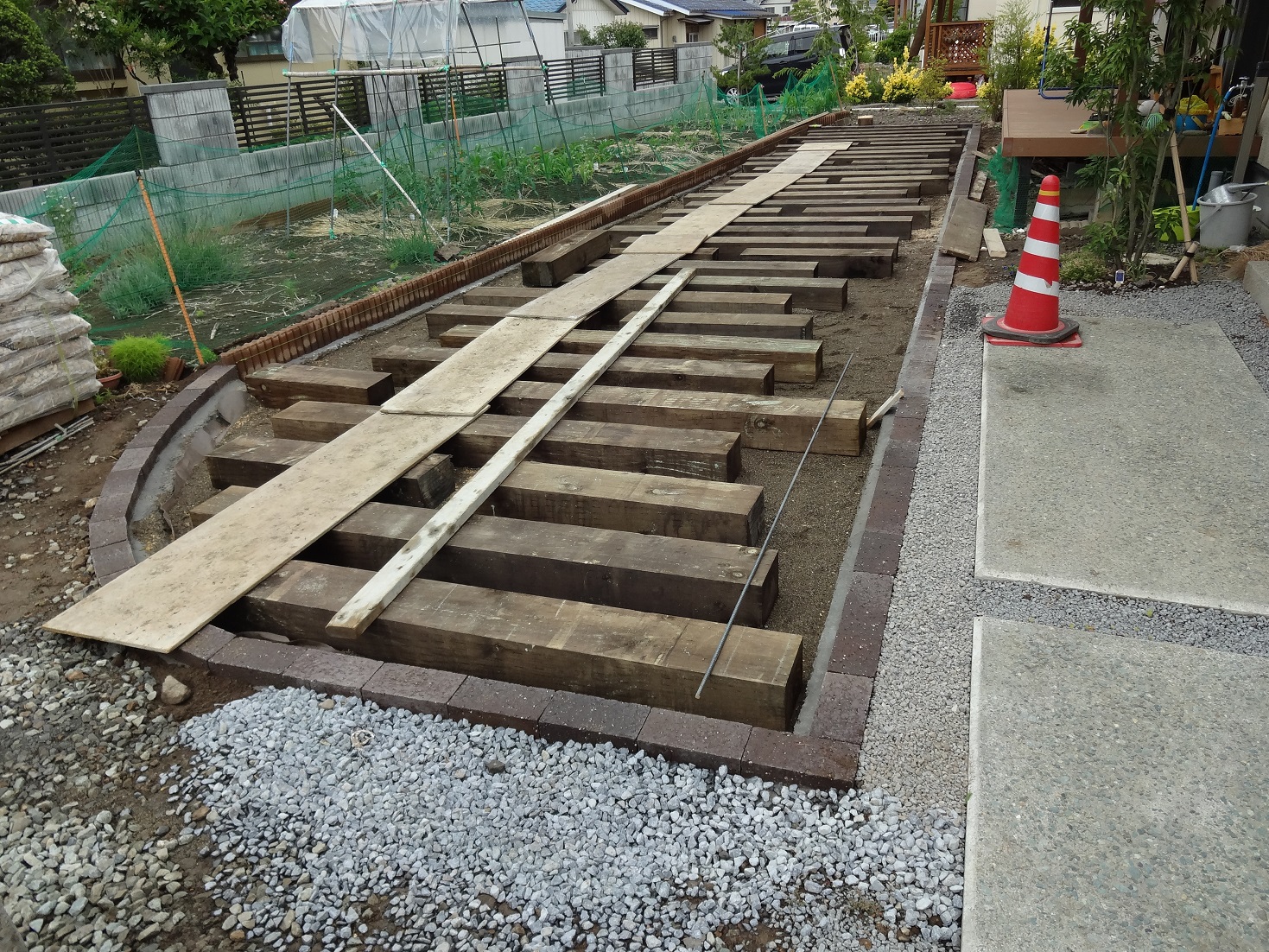 庭側ですが、レンガで縁取りして枕木を敷き終わったところです。