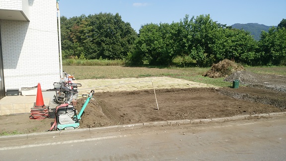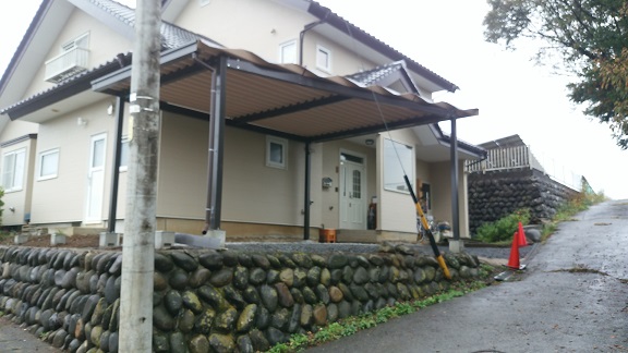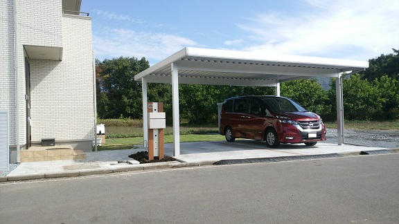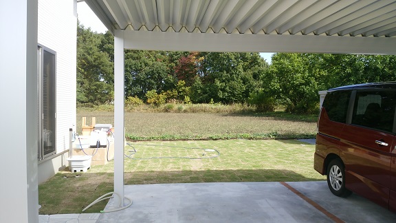 駐車場コンクリート打ち、カーポートは、鉄骨で敷地に合わせて設計しました。