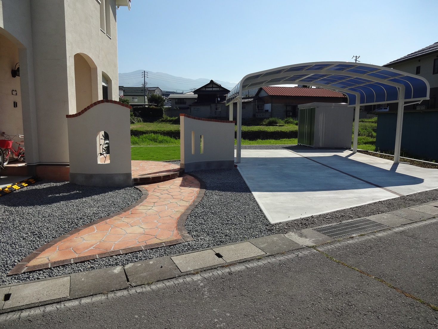アプローチ、門柱、駐車場など一式施工させて頂きました。
