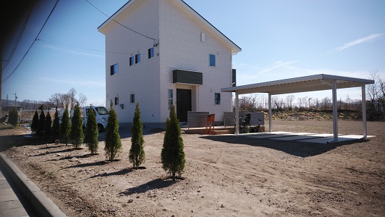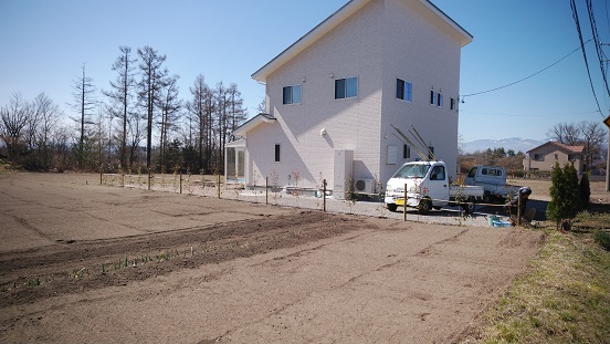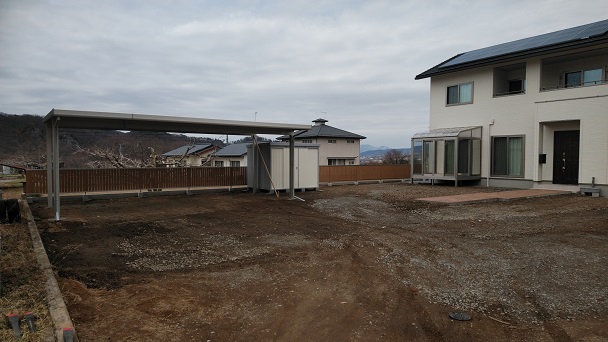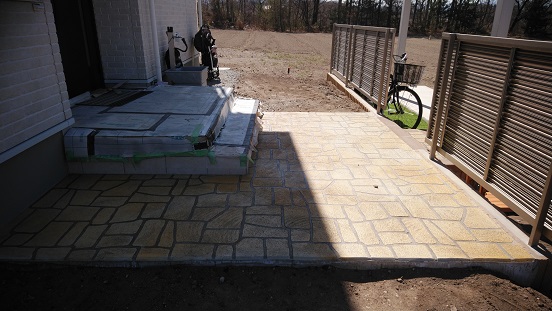 舗装です。境界廻りはコニファー・レットロビンを植えて目隠しにする予定です。