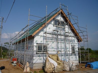 屋根には防水のルーフィング、壁には同じく透湿防水シートを張り、
