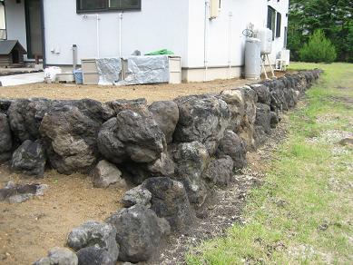 そして、廻りの境界の工事です。勾配がある敷地でしたので、焼石で土留めを施工しました。 かっこよく仕上がってますね~