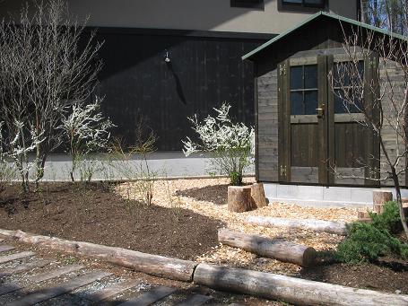 さらに、前年にお施主様自身が施工した木製物置の廻りも植栽して、敷地内通路は、針葉樹のチップ材を敷きました。チップの上を歩くと自然素材特有のやわらかさもあって、とっても良い感じです。