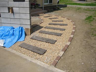 同じ現場のアプローチ部分です。 色合いがすてきで、お施主様のセンスが光りますね。門袖も塗り壁にして芝を貼って完成になります。