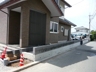 道路際の基礎に化粧ブロックを積んでいるところです。