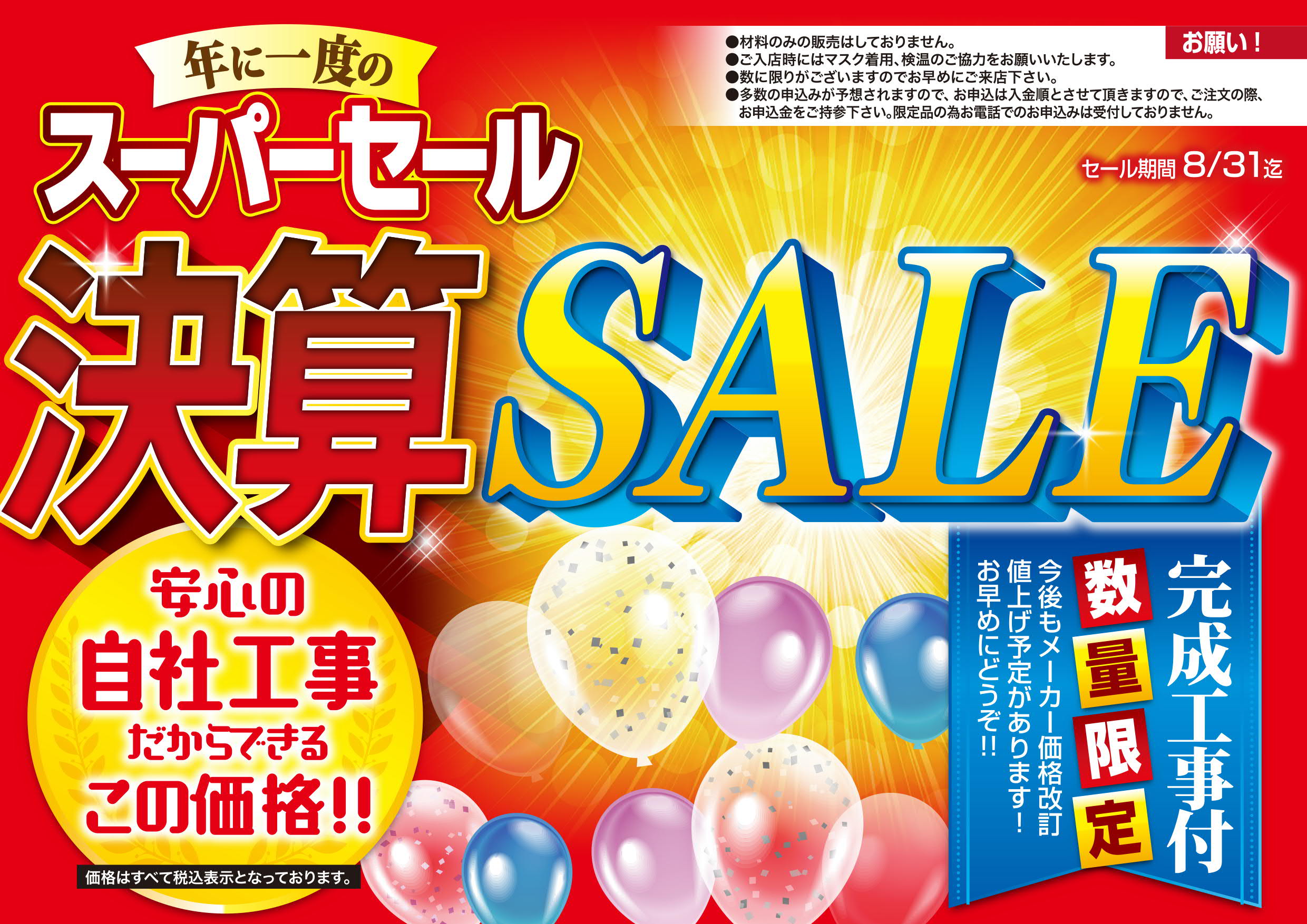 GW期間中の特別休業のお知らせ 誠に勝手ながらゴールデンウィーク期間中下記の通り休業とさせていただきます。 5月1日(日)~5月8日(日)迄 休業とさせていただきます。 ※一部、現場工事等は動いております場合がございますが店舗は休業となりますので 何卒ご了承下さいますようお願い申し上げます。 9日(月)より通常営業とさせて頂きますのでよろしくお願い申し上げます。 |